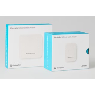 Biatain® Silicone Non-Border est un pansement de mousse de polyuréthane doux et flexible muni d’un film supérieur perméable à la vapeur et imperméable à l'eau et aux bactéries, d’un adhésif en silicone non irritant et perforé et de films protecteurs turquoise.